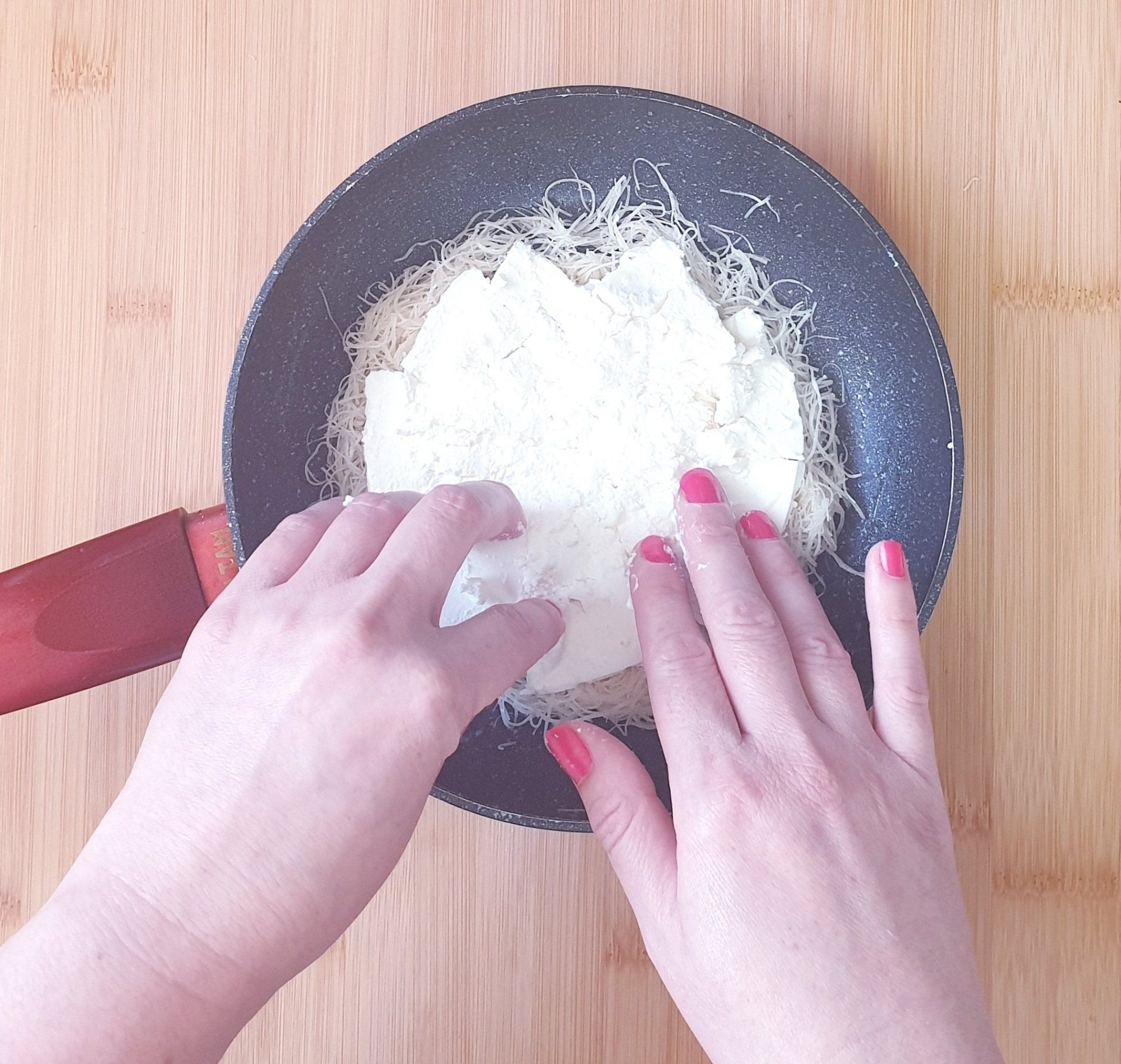 5. מניחים גבינת ריקוטה על אטריות הקדאיף שבמחבת ומשאירים מעט שוליים (חשוב שהפיזור של הגבינה יהיה אחיד עד כמה שניתן).