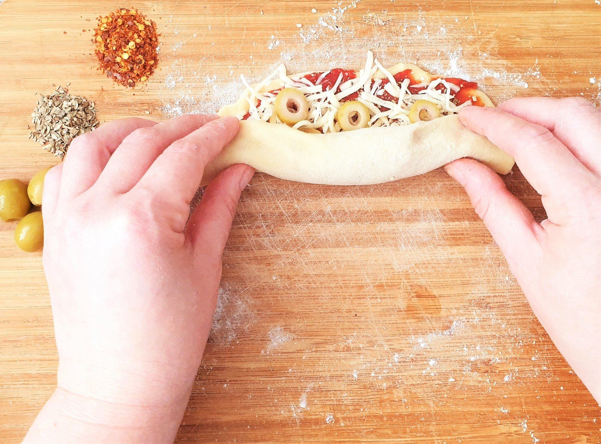 - לאחר ששמים את המלית והתוספות מגלגלים לגליל (ראו תמונות מעל המתכון). סוגרים את הקצוות של כל גליל היטב.