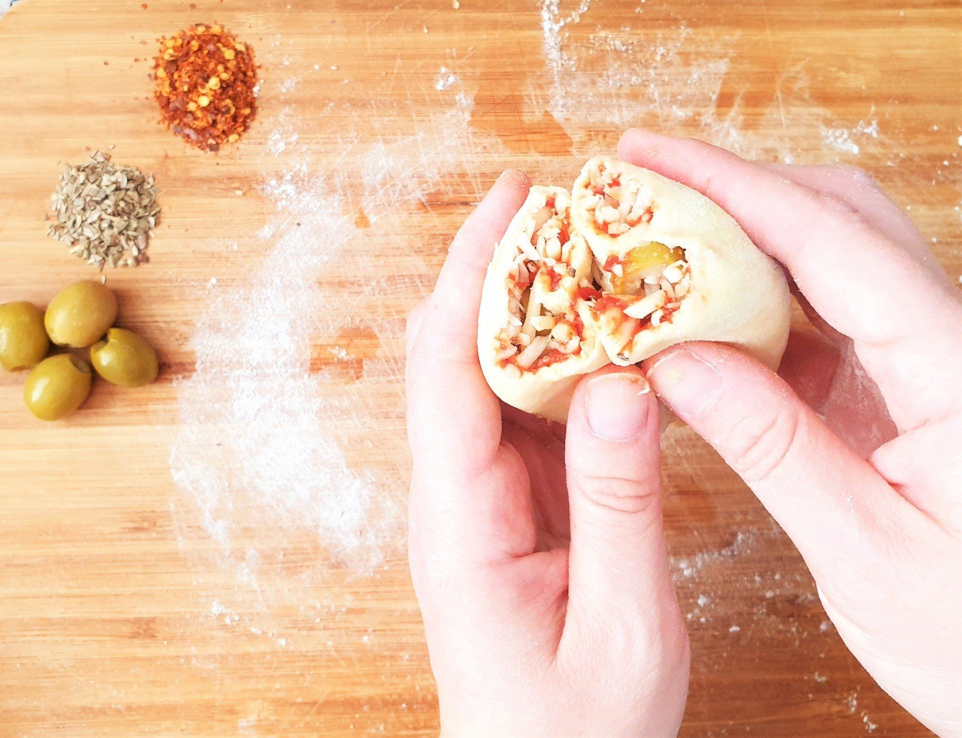 - מרדדים כל כדור בנפרד לעובי של כ - 3 מ"מ וממלאים במלית הרצויה ובתוספות (זו יכולה להיות כל גבינה ותוספת שאוהבים ו/או ממרחים מוכנים).
